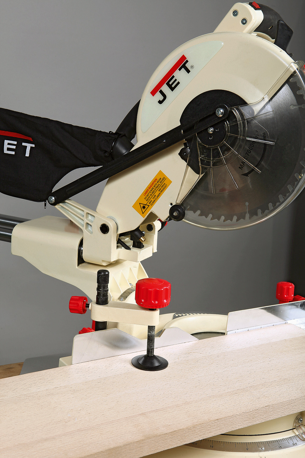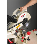 Торцовочно-усовочная пила Jet JSMS-10L имеет все необходимые функции распиловки с поворотом / наклоном и в дополнение к этому оснащена механизмом протяжки. Он обеспечивает продольный ход пильной части, благодаря чему больше длина реза и, соответственно, ширина распиливаемых за один проход деталей (она достигает 305 мм). Кроме того, возможность протягивать пилу может быть использована для нарезки шипов с края заготовки (усовки) и для выполнении глухих пазов (глубину при этом ограничивают регулируемым упором).