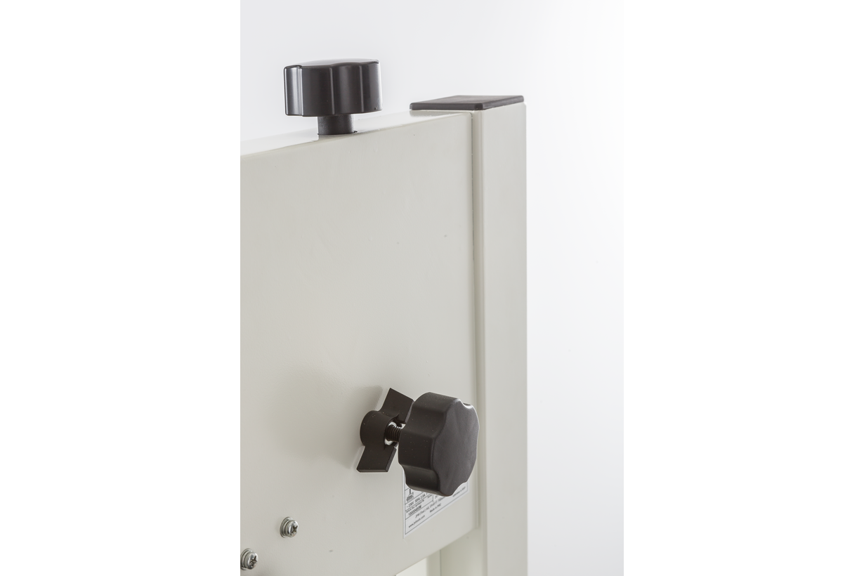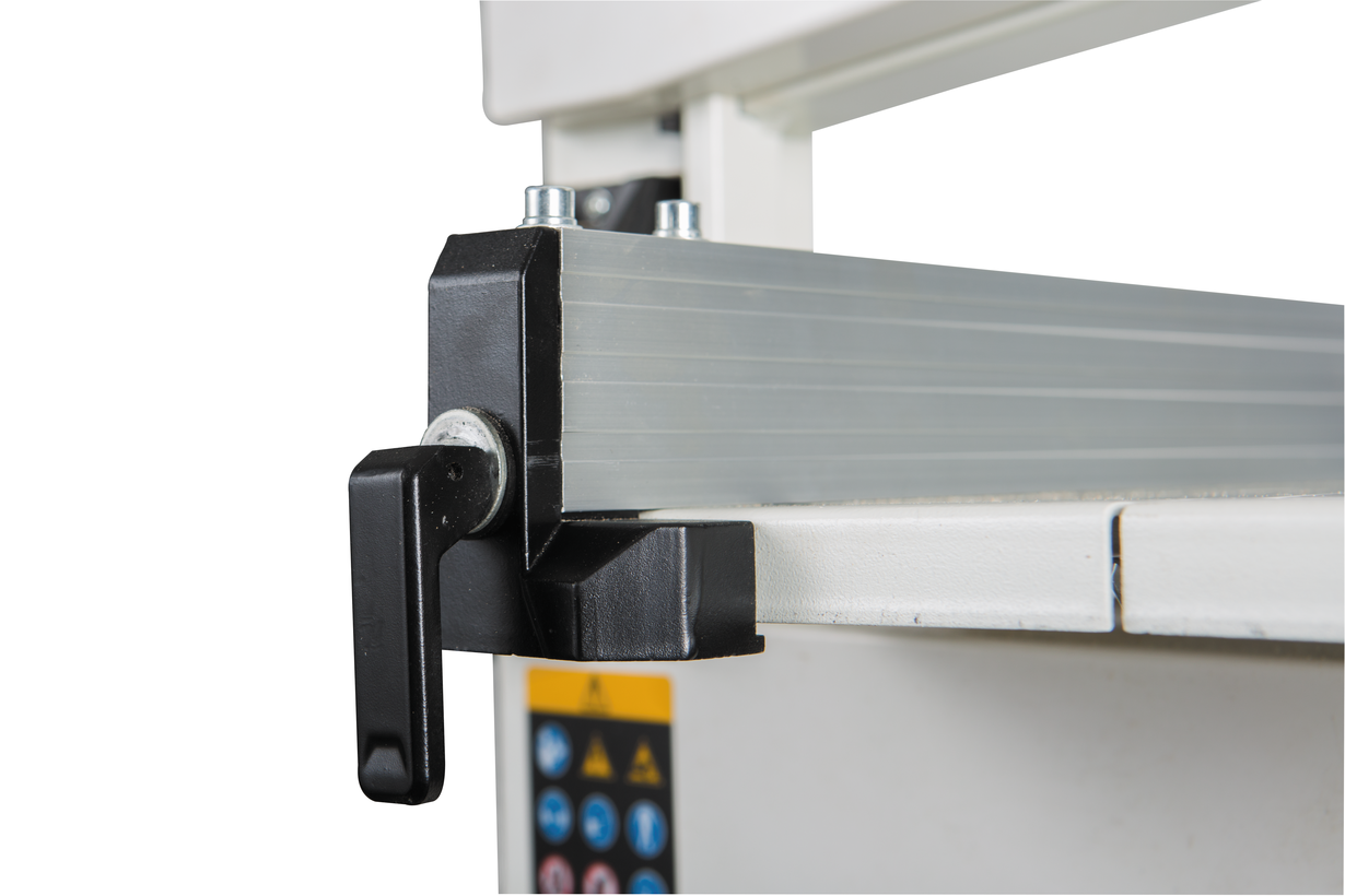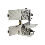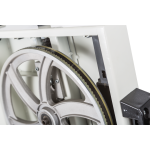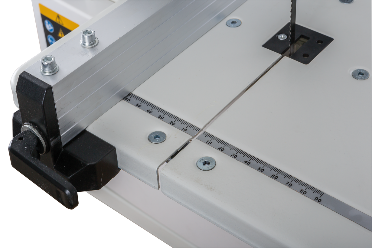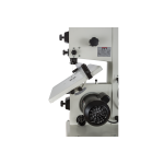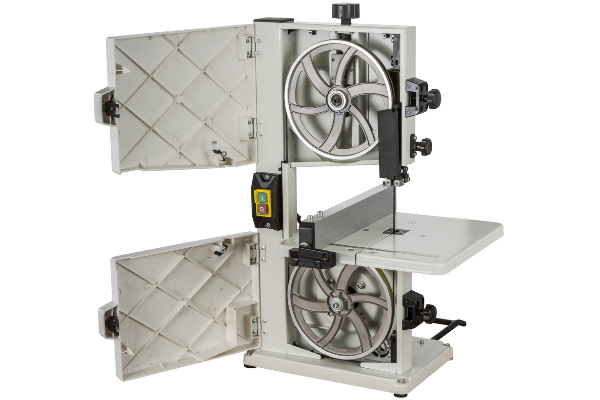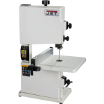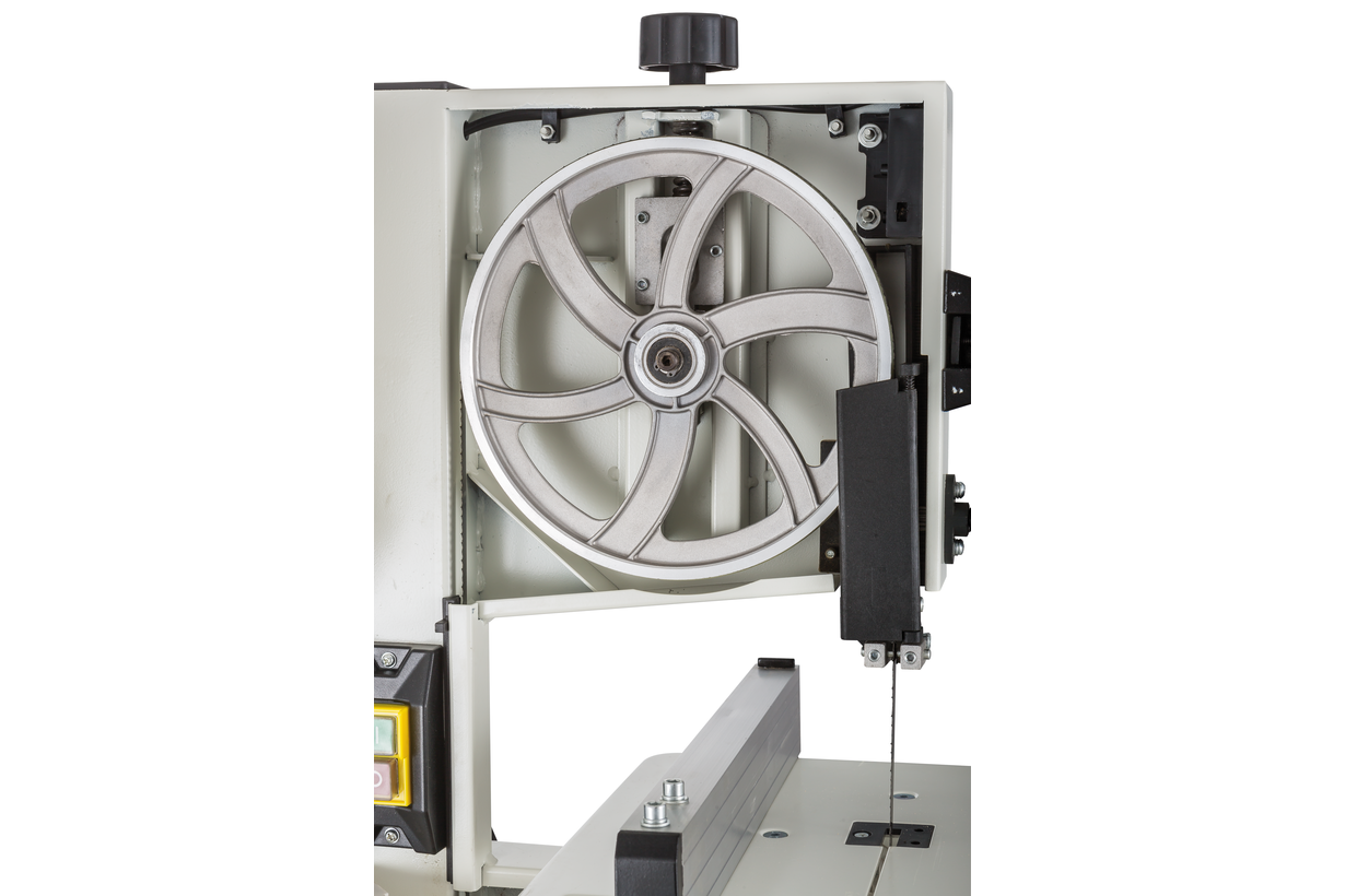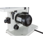 Jet JWBS-8-M компактный ленточнопильный станок для хобби и эпизодических работ по дому, гаражу или хозяйству. Его устройство очень рационально, что позволило реализовать все стандартные функции ленточной пилы, не усложняя конструкцию. Ведущий шкив диаметром 210 мм установлен прямо на вал двигателя: он делает 1420 оборотов в минуту и понижающий редуктор не требуется. Направляющие полотна изготовлены в виде цилиндрических штифтов, которые удерживают ленту своими торцами. По мере износа или при замене ленты их регулируют, сдвигая вдоль оси и зажимая винтами с шестигранником. Продольную опору обеспечивает ролик с шарикоподшипником. Весь верхний узел опускается и поднимается в зависимости от толщины заготовки; аналогично устроенный нижний узел неподвижно закреплен под рабочим столом.