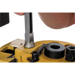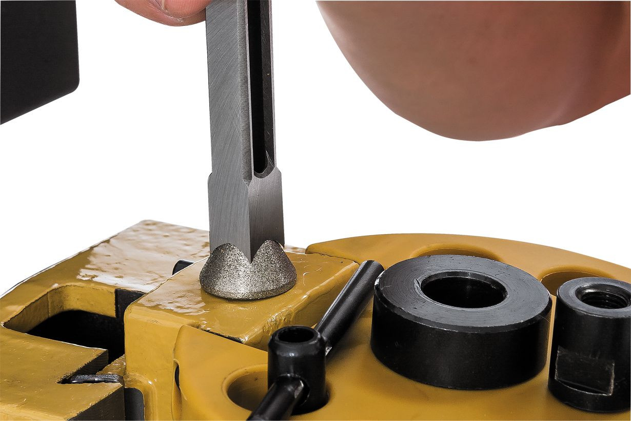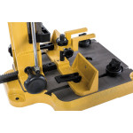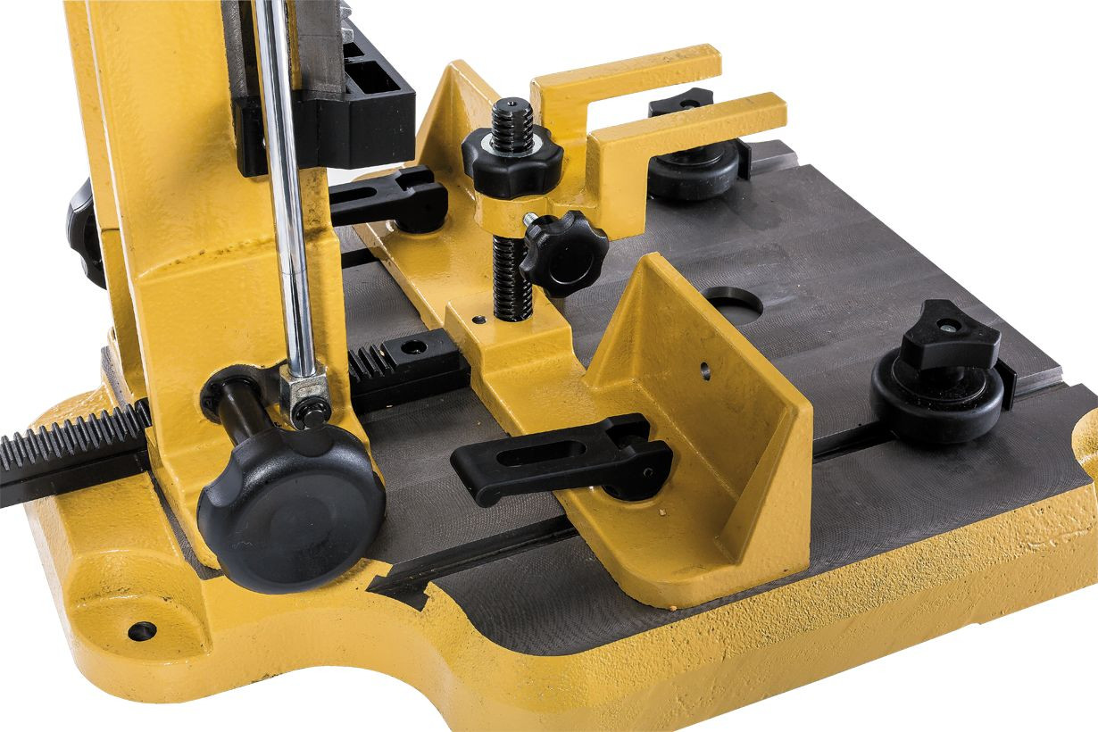 Чугунная колонна с долбежной частью жестко прикручена к чугунному же основанию, что обеспечивает прямые под углом ровно 90° края пазов без предварительных настроек и регулировок. Симметричное расположение крепежных отверстий позволяет переустановить колонну с поворотом на 180° так, чтобы работать от пола с дверными полотнами, оконными переплетами и другими крупными изделиями.